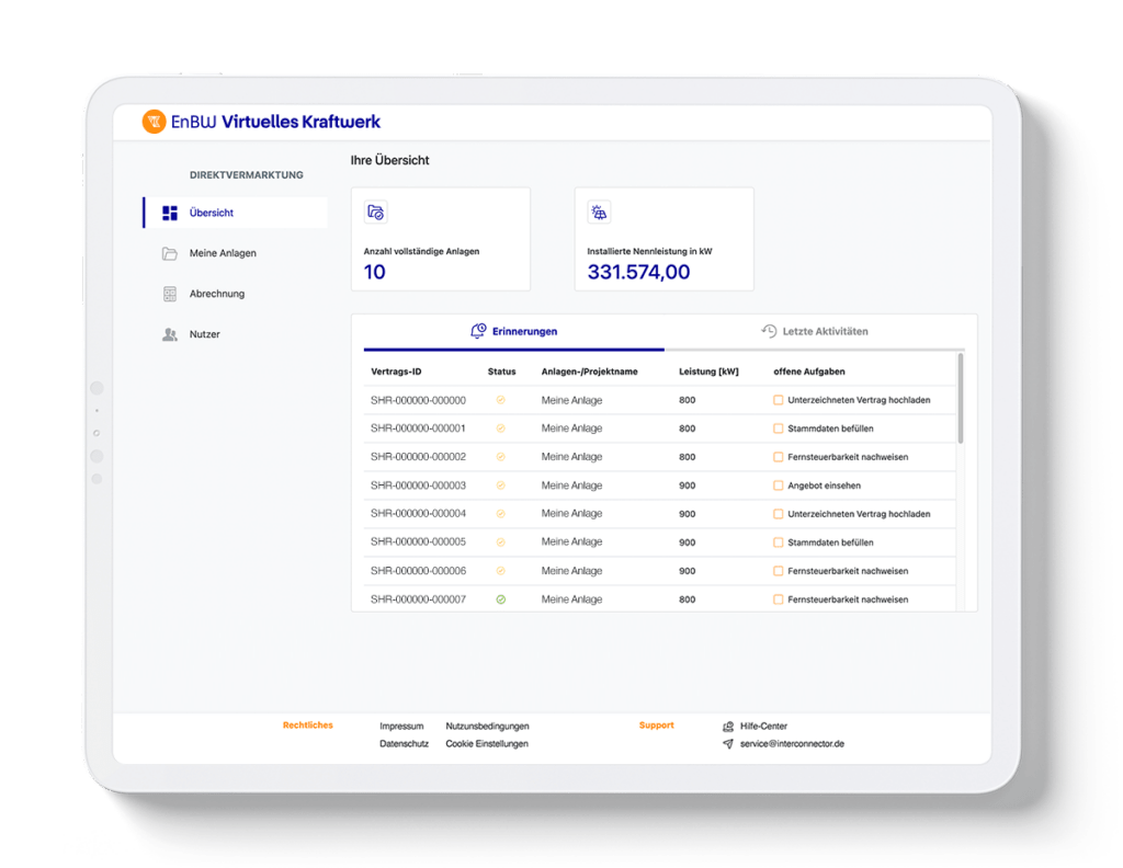 Unmittelbar nach Ihrer Kontaktanfrage melden wir uns bei Ihnen. Im nächsten Schritt schicken wir Ihnen den Kooperationsvertrag zu. Ihren unterschriebenen Vertrag können Sie einfach per Mail zurücksenden. Anschließend erstellen wir Ihnen einen Portalzugang für die von Ihnen genannten Nutzer und stellen ggf. gewünschte Tools (Angebotsformular, Ertragspotenzialrechner) in Ihrem oder im EnBW-Design bereit. Nach der Freischaltung Ihres Portalzugangs können Sie neue Anlagen im Direktvermarktungsportal anlegen und verwalten und eine Übersicht Ihrer Provision sehen.